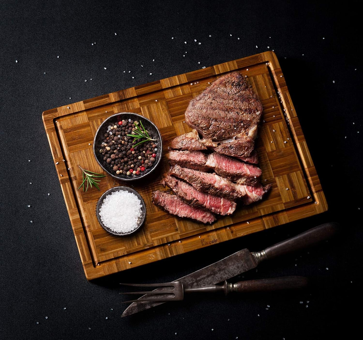 DEEP JUICE GROOVES: Built-in deep juice grooves to capture excess liquid during food prep. No need to worry about meat, fruit, or vegetable juice running off the board and onto your countertop when cutting. Thus you can keep your work area beautiful even during the busiest cooking time.